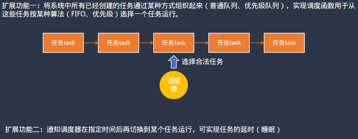 实际上一个完整的RTOS提供的功能很多,例如任务的睡眠、内存管理等各种功能。不同任务由于读写同一内容,也可能发生读写冲突的情况。任务也有可能在执行过程中需要因为需要等待某些外部事件需要暂停运行。甚至于某些任务如果没有主动调用task_switch(),会一直占用CPU运行,进而导致其它任务迟迟没有运行的机会。